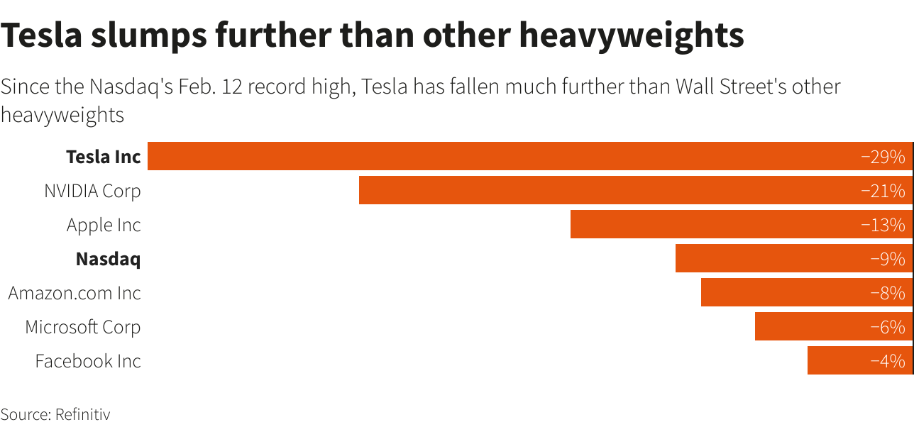 Технологические и другие растущие акции значительно снизились с 12 февраля, когда Nadsaq закрылся на своем последнем рекордно высоком уровне. Однако, падение Теслы за это время было гораздо глубже, чем у других тяжеловесов Уолл-стрит.
